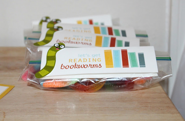 [Free printables for gummy bookworms and bookmarks found here]